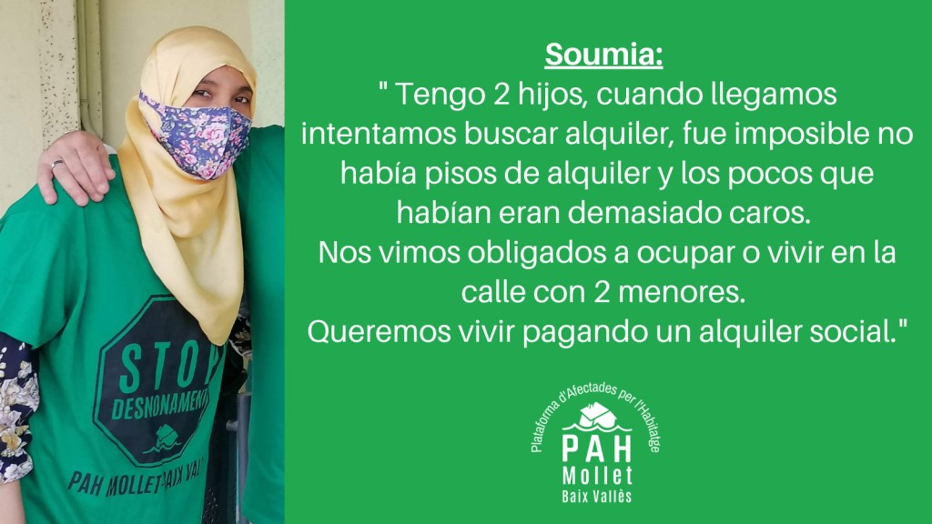 El Decreto suspendido, también afecta a las familias que ocupan vivienda vacía, en manos de la banca o de fondos buitre, por que el sistema les dio la espalda. Hablamos de familias como el caso de Alba, Alicia o Soumia, a las que se les negó tiempo atrás toda alternativa habitacional y tuvieron que ocupar para poder tener un techo. Lo único que quieren es poder vivir dignamente, pagar un alquiler social, regularizar esta situación a la que se vieron empujadas y recuperar su derecho a la vivienda.