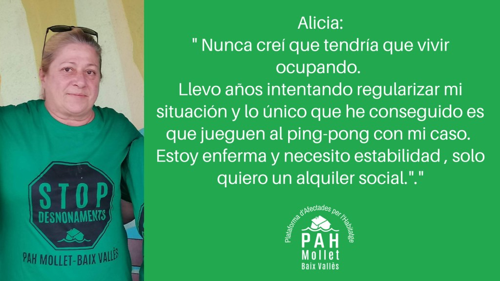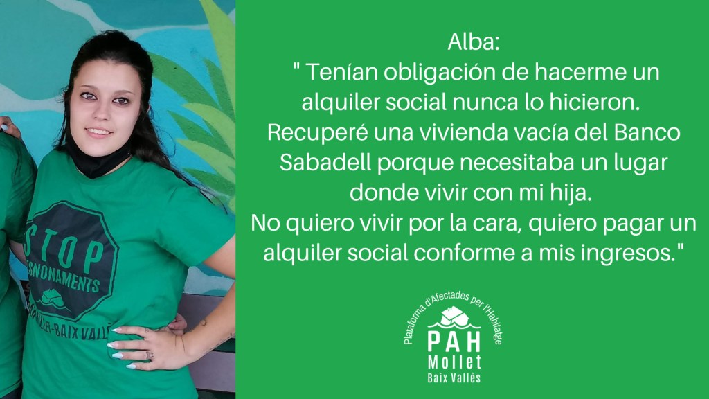 El Decret suspès, també afecta les famílies que ocupen habitatge buit, en mans de la banca o de fons voltor, perquè el sistema els va donar l’esquena. Parlem de famílies com el cas de l’Alba, l’Alícia o la Soumia, a les quals se’ls va negar temps enrere tota alternativa residencial i van haver d’ocupar per a poder tenir un sostre. L’única cosa que volen és poder viure dignament, pagar un lloguer social, regularitzar aquesta situació a la qual es van veure empeses i recuperar el seu dret a l’habitatge.